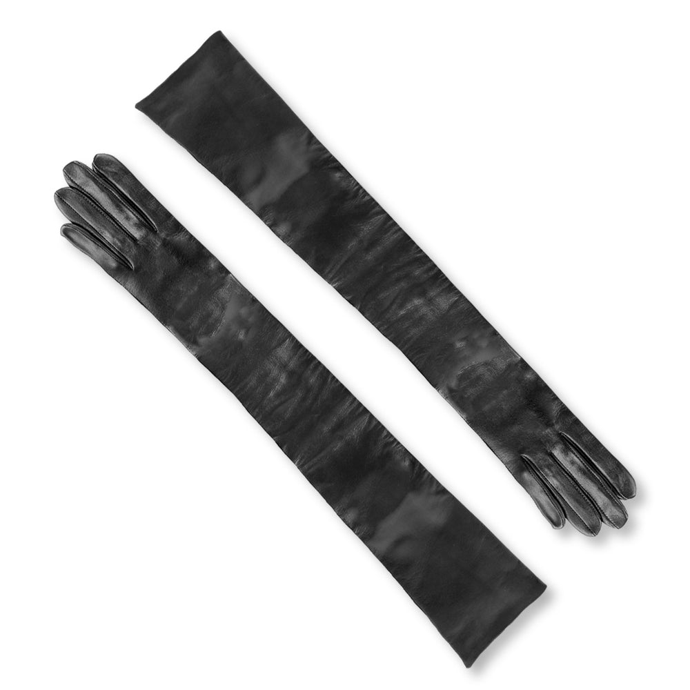 Our glove model 202 reaches above the elbow. The buttery soft leather hugs the entire arm. The gloves have no zipper or buttons, but are closed from top to bottom.