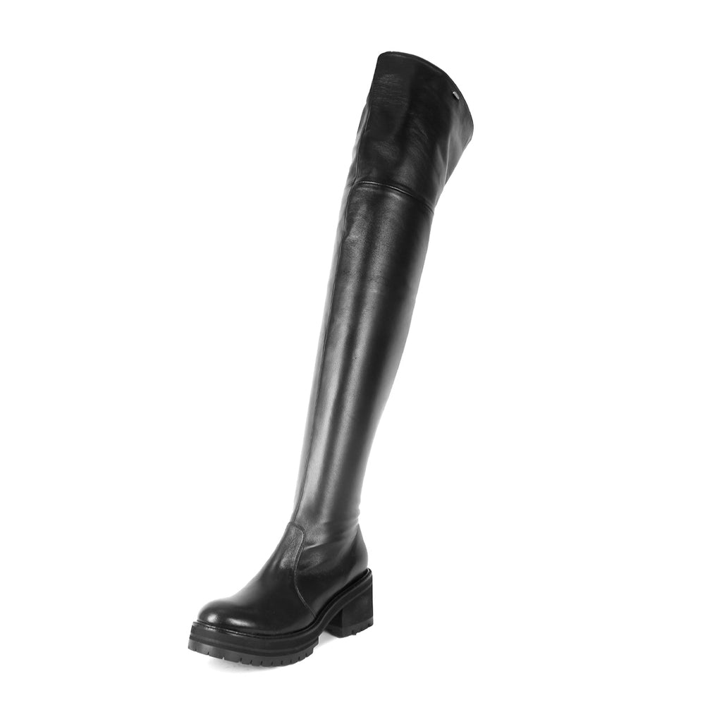 Ces cuissardes sont confectionnées en cuir souple et s'adaptent à votre jambe comme une seconde peau. En revanche, la semelle plateforme robuste repose vos pieds comme s'ils étaient sur des nuages. Combinez les bottes avec un short ou une mini-jupe ou une robe pour un look super cool !